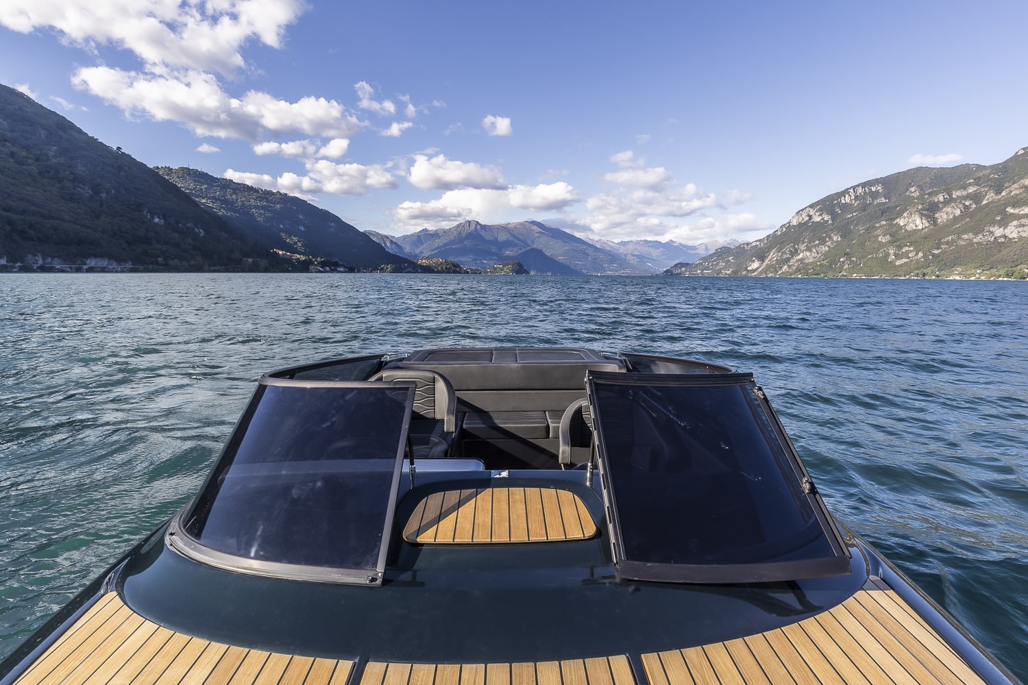Otaczająca stanowisko sterowania szyba przednia na całą szerokość łodzi podkreśla sportowy charakter modelu E26 Classic, zapewniając ochronę sternikowi i osobie na miejscu obok. Na środku szyby umieszczono otwór dający dostęp do pokładu dziobowego.