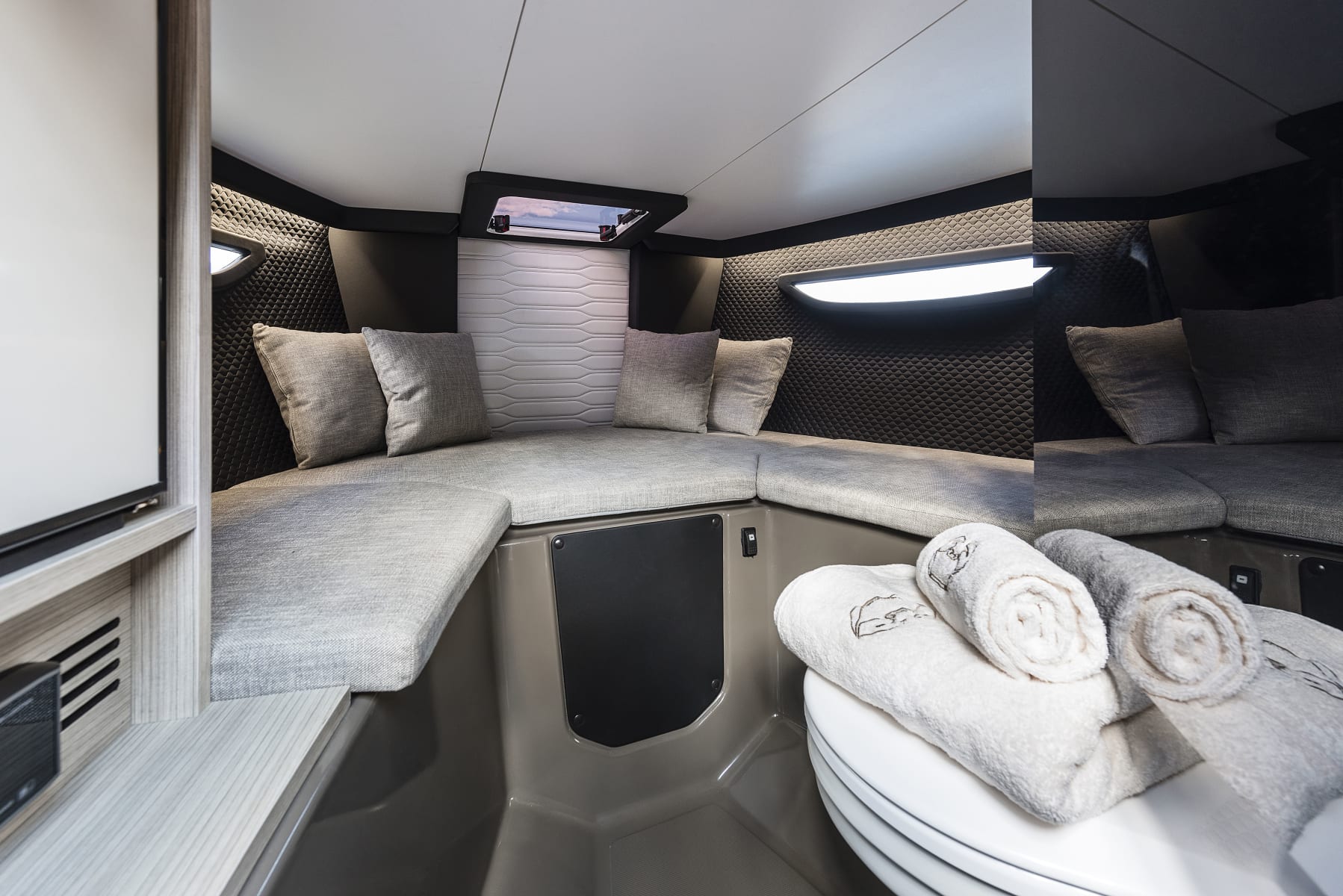 Profil łodzi oraz stanowisko nawigacyjne utrzymane są niewątpliwie w sportowym stylu, natomiast eleganckie meble wywołują poczucie wygody i komfortu na pokładzie.