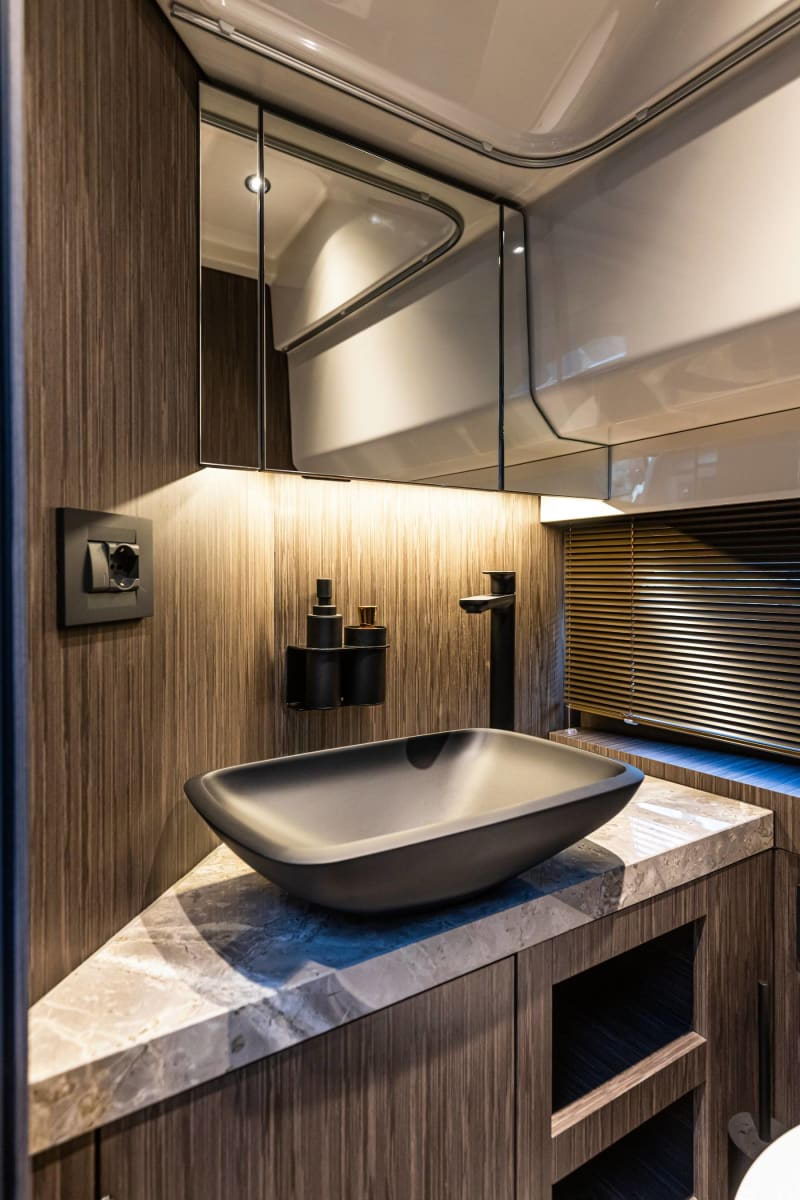 Życie na pokładzie staje się prostsze i bardziej niezależne, nawet podczas dłuższych wypraw: oprócz 35-litrowej lodówki w kokpicie w kabinie znajduje się druga, 90-litrowa. Mocny i równomiernie rozmieszczony system audio gwarantuje idealną ścieżkę dźwiękową na każdą chwilę.