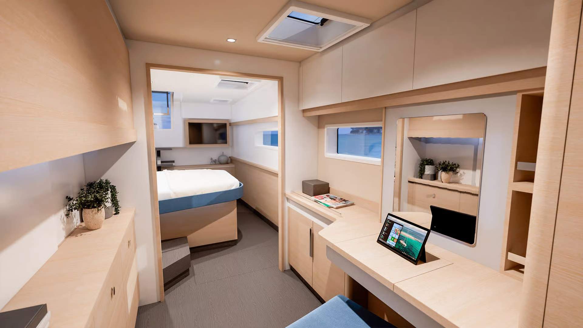 FP48 oferuje wyjątkową przestrzeń właścicielską, niespotykaną w katamaranach tej wielkości. Cały lewy kadłub został przeznaczony na luksusowy apartament armatora typu full-suite, uzupełniony o dodatkowe pomieszczenie wielofunkcyjne.