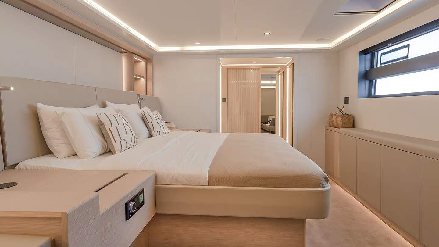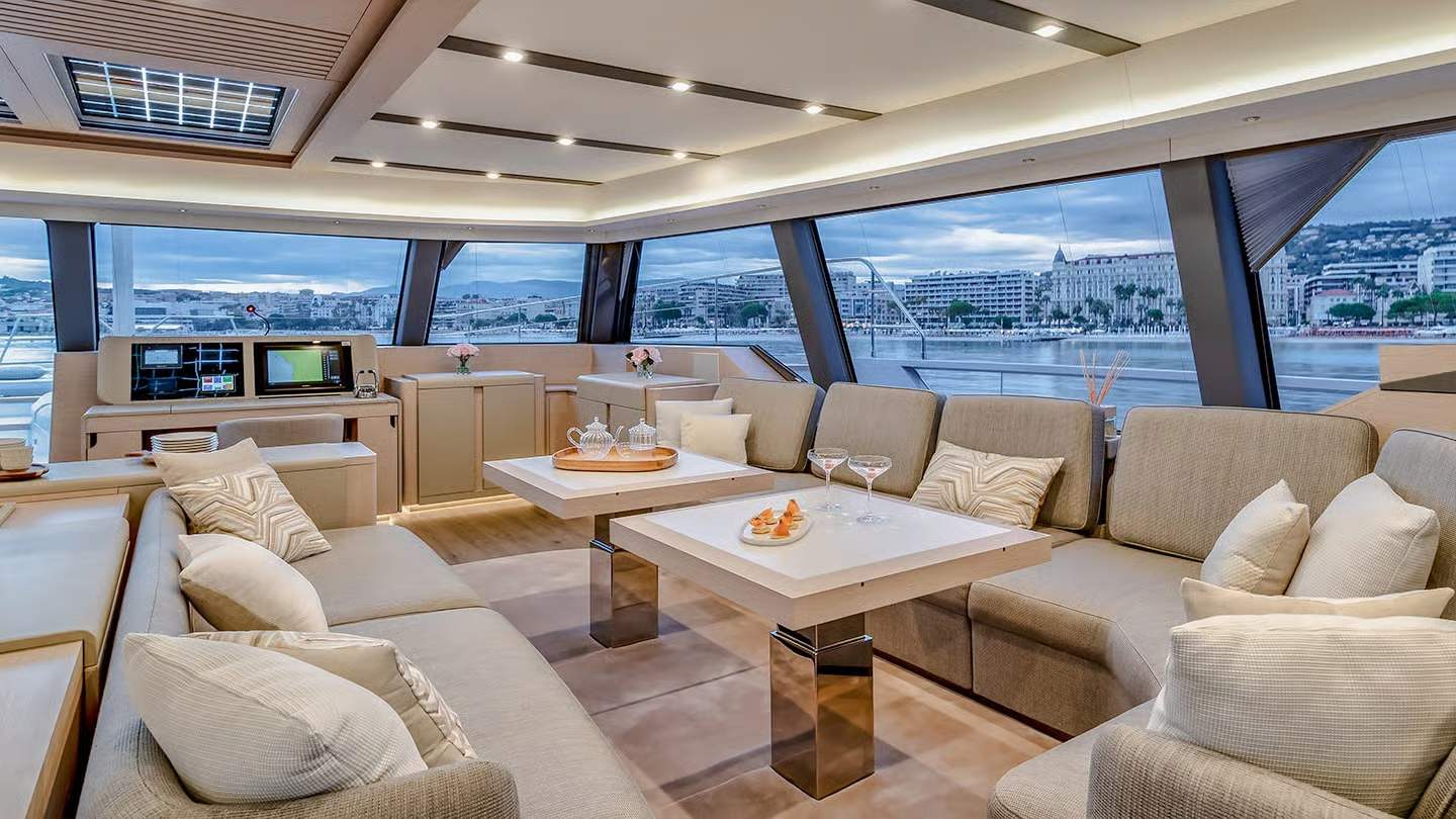 Millésime 2024 w Thíra 80 to jeszcze więcej światła, spójności i nowoczesnej elegancji. Materiały i wykończenia ewoluują wraz z trendami, zachowując ponadczasowy charakter flagowej jednostki Fountaine Pajot.