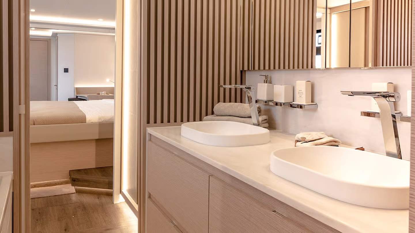 Kabina armatorska Thíra 80 przewyższa przestrzenią wszystkie inne katamarany tej klasy. To jednak dopiero początek. Jej ogromna łazienka en-suite może zostać wyposażona w:
