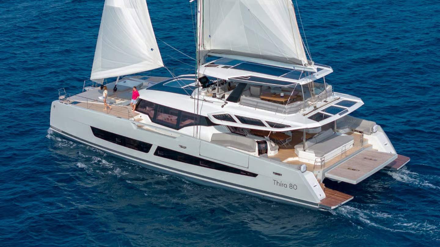 Thíra 80 łączy całe know-how, filozofię i doświadczenie Fountaine Pajot, tworząc luksusowy katamaran absolutnie niezwykły. Przy długości niemal 24 metrów oferuje przestrzeń pozwalającą osiągnąć szczyt życia na wodzie – a mimo to wciąż potrafi zaskakiwać i przekraczać oczekiwania armatorów.