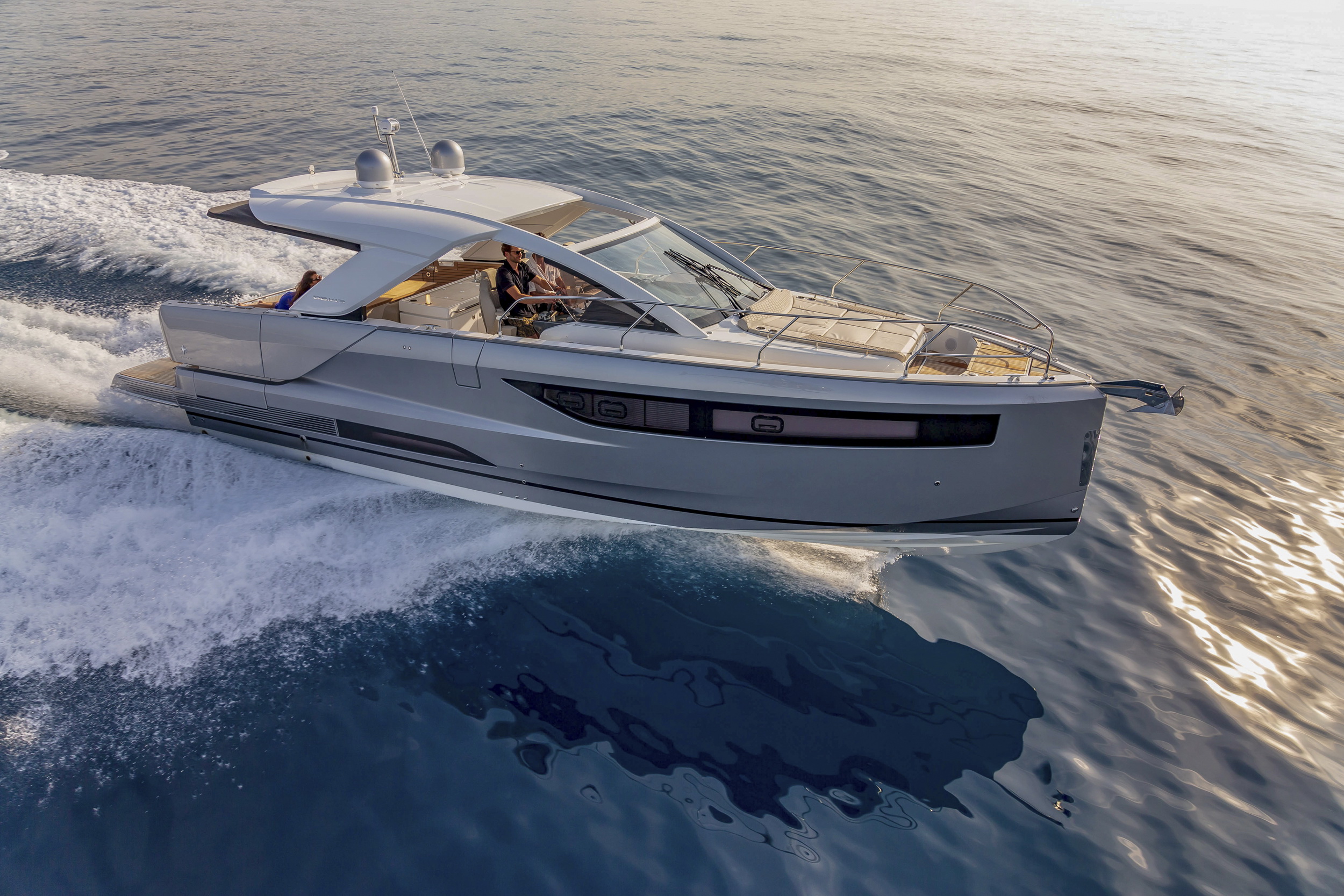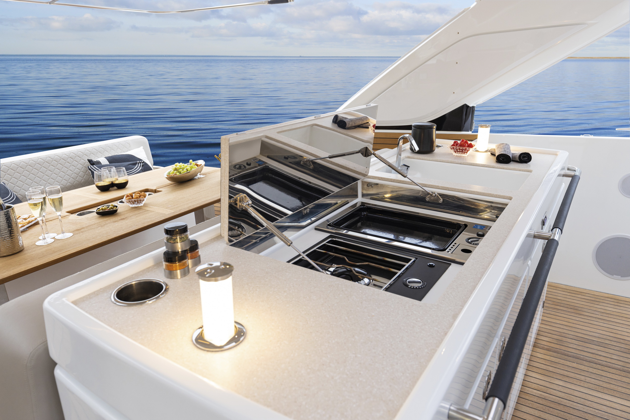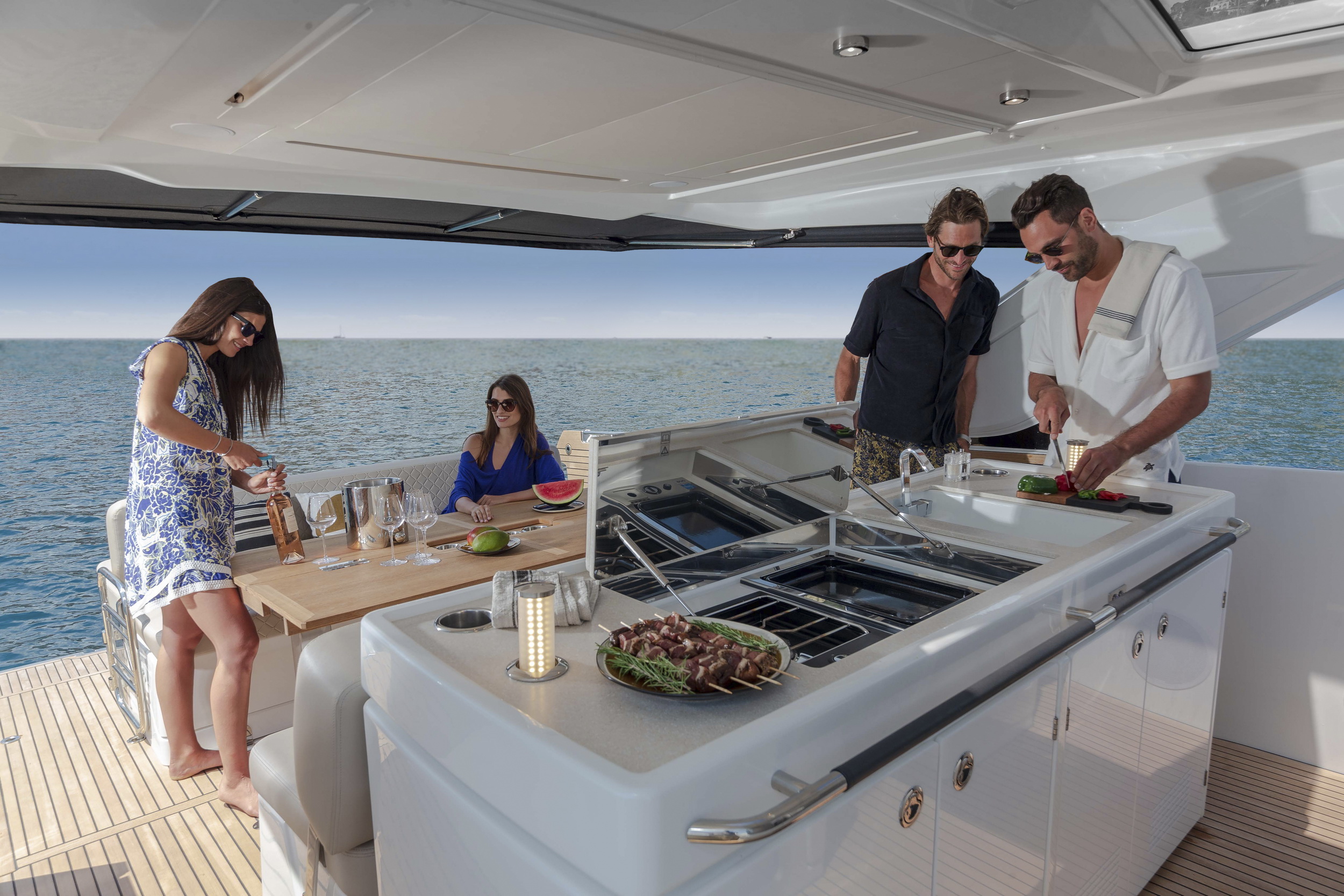 Nad kokpitem zastosowano konstrukcję T-top, która zapewnia cień oraz ochronę przed słońcem. Jednocześnie zachowuje otwarty charakter pokładu i umożliwia naturalną wentylację przestrzeni wypoczynkowej.