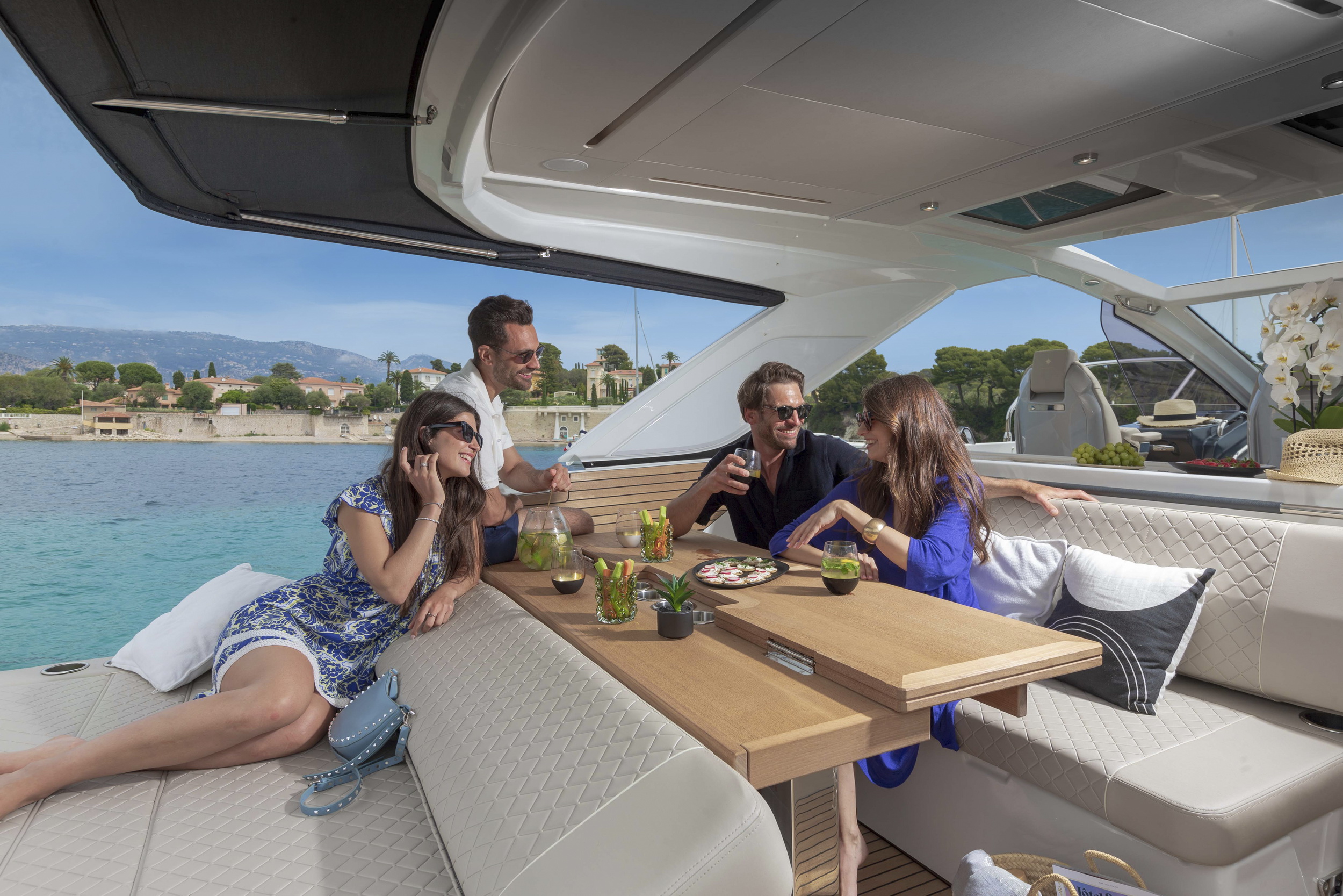 Centralną częścią łodzi jest rozległy kokpit, w którym znajduje się duża strefa wypoczynkowa z sofami oraz stołem. Układ przypomina salon na zewnątrz i sprzyja wspólnemu spędzaniu czasu podczas postoju lub spokojnej żeglugi wzdłuż wybrzeża.